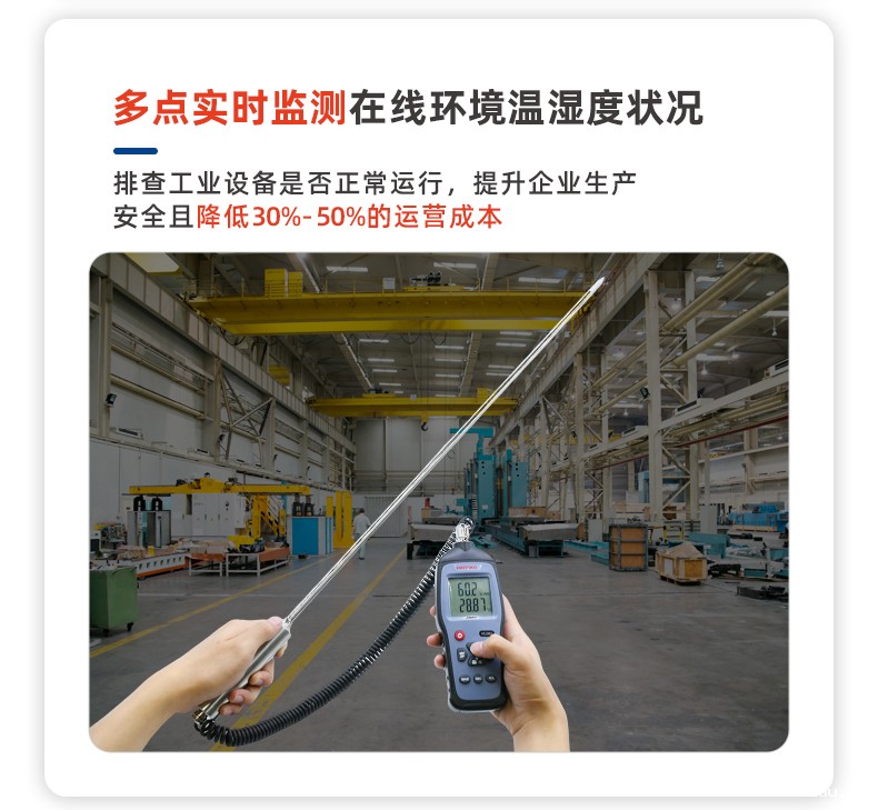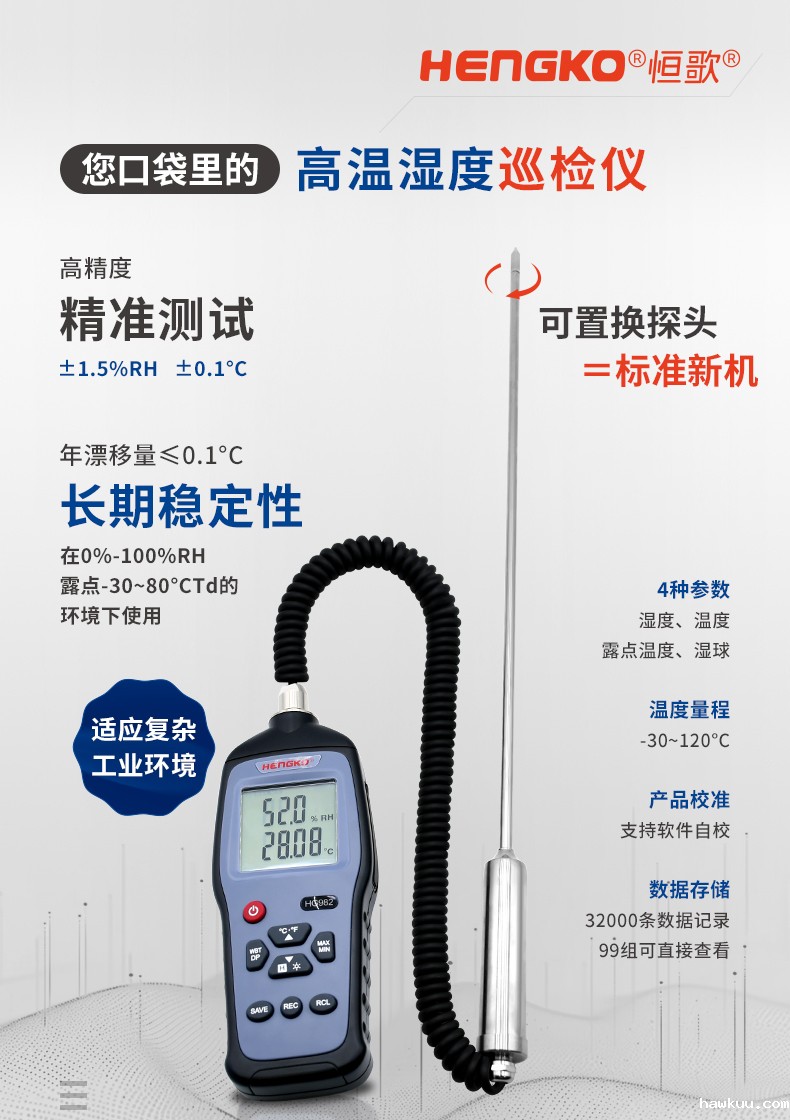 在高温环境80~120°C下测量表现出众。在湿度范围0-100%RH,且露点温度-30~80°CTd的友好环境下使用,具备卓越的高精度、高准确性、快速的数据采集与反馈能力,以及无与伦比的长期稳定性,在现场精准测量方面表现出色,长杆分体探头对难以触及或复杂的测量环境提供了多元化且安全的测量方式,备受工业用户认可的高温湿度巡检仪。