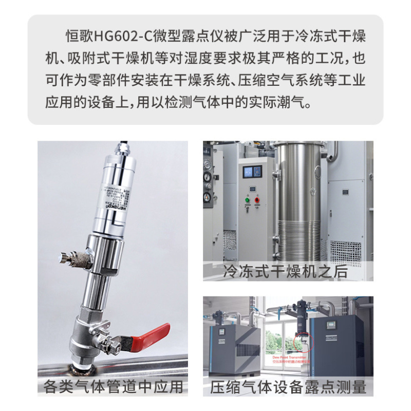 HG602-C是一款专为冷冻式干燥机设计的露点变送器,以高精度、稳定性和经 济性为核心优势,凭借紧凑设计和快速响应,成为压缩空气系统效能提升与工业降 本增效的理想选择。