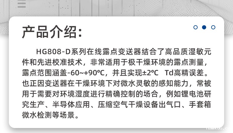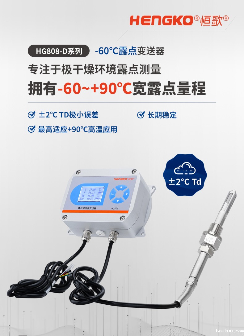 HG808-D专为极干燥环境下高精度湿度监测而设计,其高精度、宽量程及工业级稳定性,可精准测量干燥气体、情性气体中的微量水分,为锂电池生产、半导体制造、食品医药等场景提供可靠的露点测量数据支持。