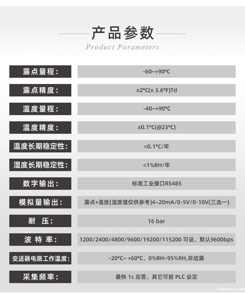 &±2°C露点精度,覆盖-60~+90°C宽露点量程,可在<90°C的温度下使用,年漂移量<0.1°C,减少校准频次,满足长期连续监测需求。