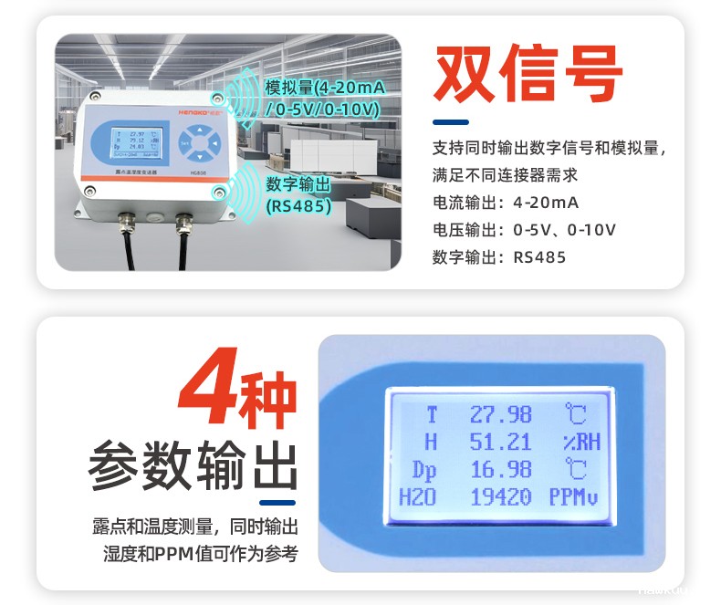 &支持RS485数字信号及两路模拟量输出(4-20mA/0-5V/0-10V),兼容Modbus-RTU协议,无缝对接PLC/DCS系统。