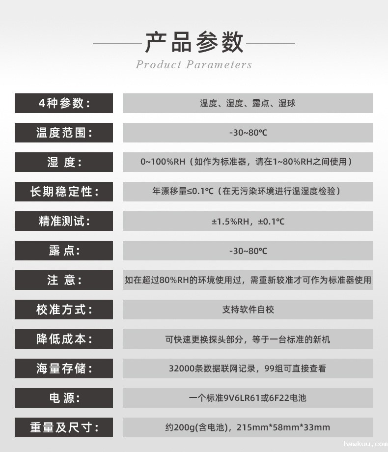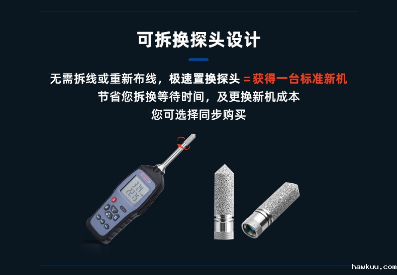 HG970/HG981/HG982系列湿度巡检仪将探头部分设计为可拆换式,并且一台手持表配备2枚相同的可拆换探头。